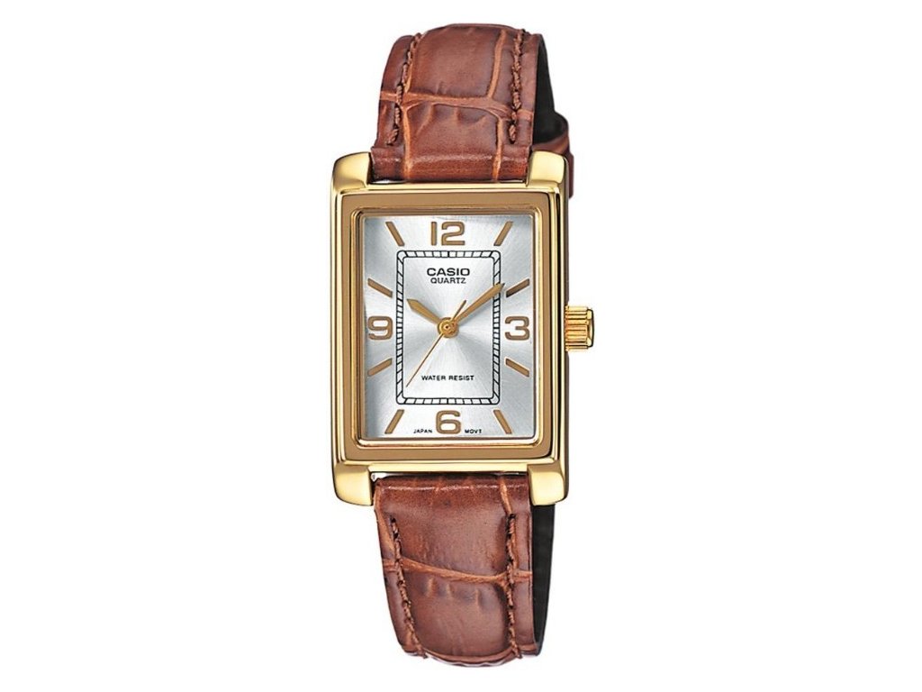 Casio Collection LTP-1234PGL-7AEG jsou elegantní dámské hodinky, které zaujmou svým klasickým a nadčasovým vzhledem. Obdélníkové mosazné pouzdro o rozměrech 21 × 32 mm doplňuje hnědý kožený řemínek s trnovou sponou, který hodinkám dodává jemný retro nádech.