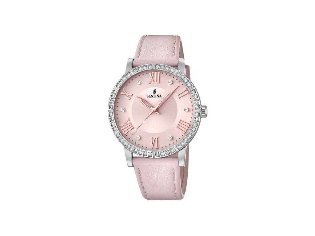 Model Festina 20412/2 patří do řady Boyfriend Collection, která je oblíbená pro svůj módní a šperkový charakter. Hodinky mají ocelové pouzdro o průměru 36,5 mm, jehož luneta je osázena čirými zirkony po celém obvodu. Na pouzdro navazuje růžový kožený řemínek s klasickou trnovou sponou, který působí jemně a ženským dojmem.