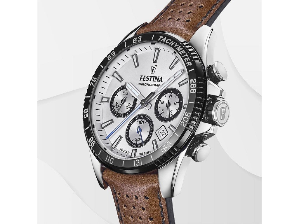 Hodinky Festina 20561/1 jsou pánské chronografy, které vynikají sportovním stylem a elegantním provedením. Jejich modrý ciferník s kontrastními subciferníky a datumovkou působí moderně a přehledně, zatímco robustní ocelové pouzdro o průměru 45 mm a ocelový tah zajišťují odolnost i dlouhou životnost. Minerální sklíčko chrání ciferník před poškrábáním a luminiscenční ručičky i indexy zaručují dobrou čitelnost i za horších světelných podmínek.