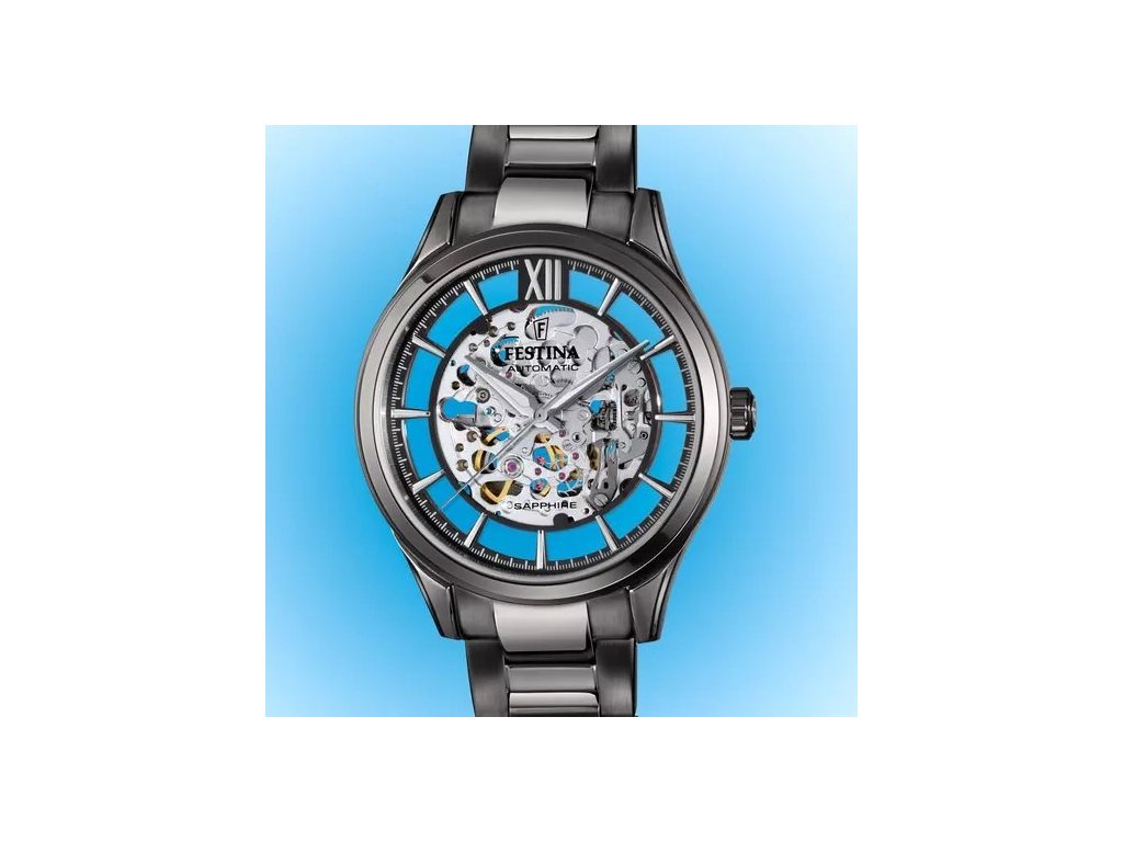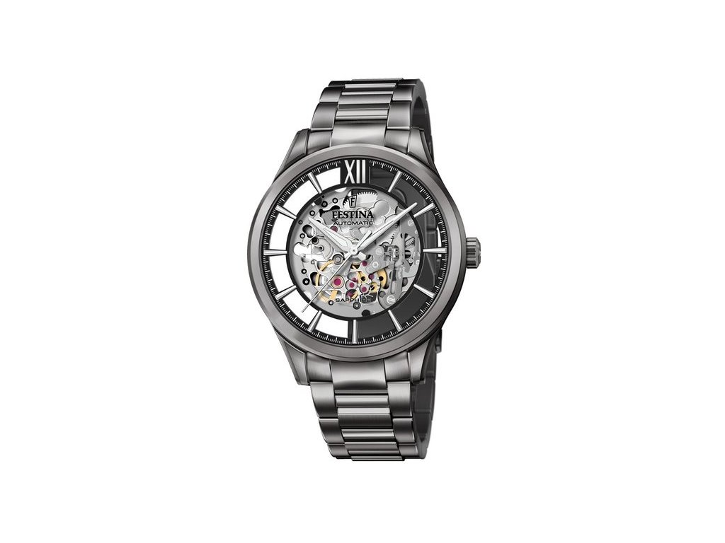 Festina 20632/1 patří do řady Automatic Skeleton a na první pohled zaujme svým otevřeným číselníkem, který umožňuje sledovat práci mechanického strojku s automatickým nátahem. Pouzdro i tah jsou vyrobeny z nerezové oceli s matnou šedou PVD povrchovou úpravou, což hodinkám dodává moderní a sofistikovaný vzhled. Číselník je chráněn safírovým sklíčkem, které je vysoce odolné proti poškrábání, a díky luminiscenčním ručičkám a indexům jsou hodinky dobře čitelné i za horších světelných podmínek. Vodotěsnost 50 metrů zajišťuje, že hodinky zvládnou běžný kontakt s vodou, například při mytí rukou nebo sprchování.