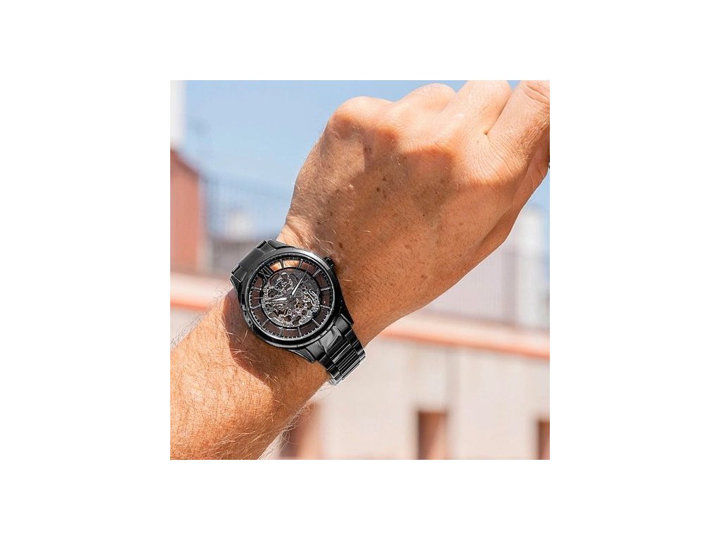 Model je poháněn mechanickým strojkem s automatickým nátahem, takže se natahuje přirozeným pohybem ruky a nevyžaduje baterii. Pouzdro z nerezové oceli má průměr přibližně 42,8 mm, což je ideální velikost pro výrazné pánské hodinky. Řemínek z oceli s překlápěcí sponou je pohodlný a bezpečný, povrchová úprava PVD v šedém tónu dodává celému modelu moderní charakter. Hodinky mají safírové sklíčko, které je mnohem odolnější než běžné minerální, a jejich vodotěsnost 5 ATM (50 m) je vhodná pro každodenní nošení. Skeletonový ciferník spolu s průhledným dýnkem nabízí fascinující pohled na chod strojku, což ocení každý milovník mechanických hodinek.