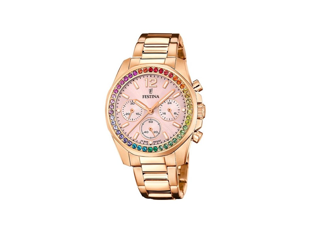 Model Festina 20639/4 patří do módní řady Rainbow, která je navržena tak, aby působila jako stylový šperk. Hodinky mají ocelové pouzdro s PVD úpravou v barvě růžového zlata o průměru 38 mm. Luneta je osázena vícebarevnými zirkony, které dodávají hodinkám hravý a luxusní vzhled.
