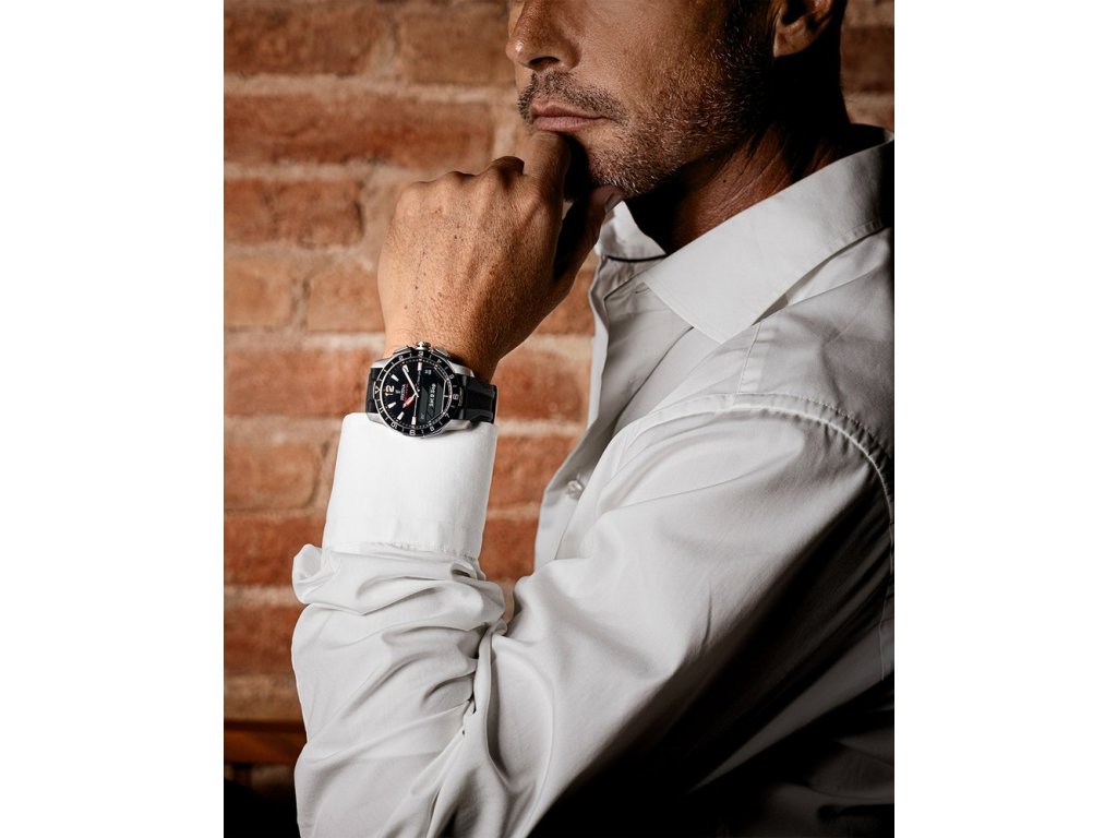 Pouzdro je vyrobeno z titanu o průměru 44 mm, což zajišťuje lehkost a vysokou odolnost. Na pouzdro navazuje černý silikonový řemínek s trnovou sponou, který je pohodlný i při sportovních aktivitách. Černý ciferník s červenými detaily působí moderně a je chráněn safírovým sklíčkem, které je vysoce odolné proti poškrábání.