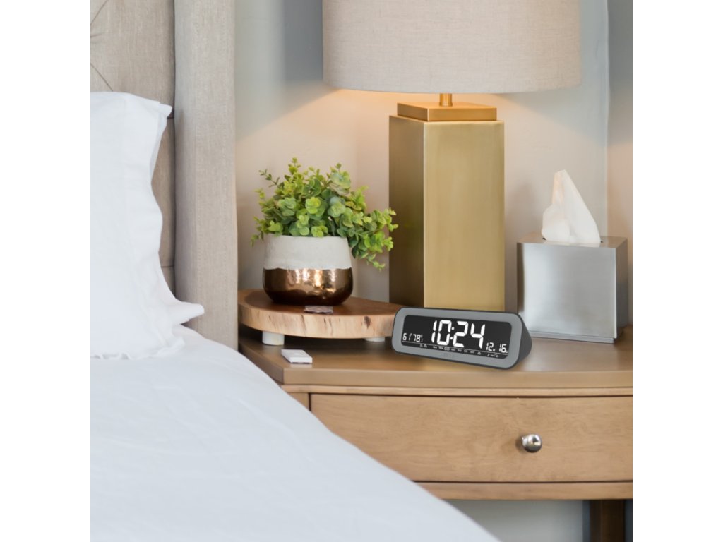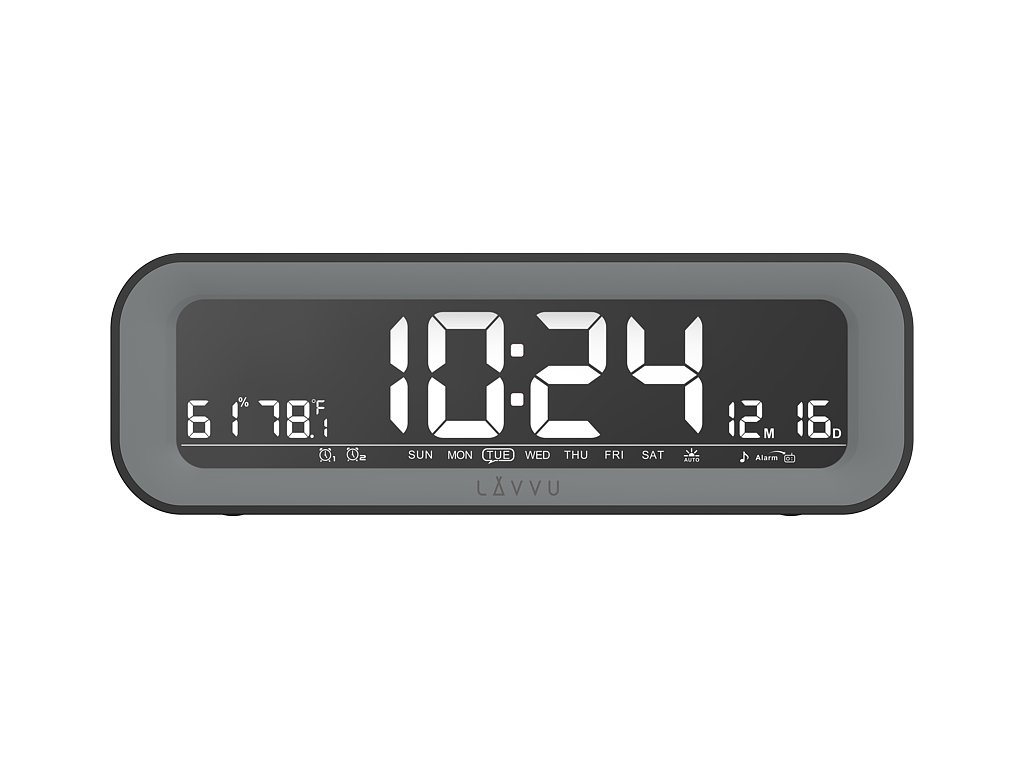 LAVVU SMART je opravdu chytrý pomocník do ložnice. Je vybaven dvěma budíky a každý je možné nastavit buď na každý den, na pracovní dny, na víkendy nebo na určitý den v týdnu. Na displeji dále najdete ukazatel data a dne v týdnu, teplotu vzduchu a vlhkost. Protože je budík napájen přes přiložený kabel, nemusíte každou chvíli řešit vybité baterie. Na zadní straně budíku jsou navíc 2 USB porty, které mohou přes noc nabíjet až 2 telefony současně a vy tak máte vše na jednom místě - na nočním stolku.