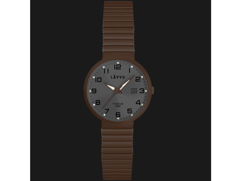 Extrémně lehké a odolné titanové hodinky LAVVU TITANIUM LUNDEN s vodotěsností 100 M. Pouzdro s minerálním tvrzeným sklíčkem, ukazatelem data a praktickým pružným tahem, který nemusíte rozepínat, ale jen ho lehce přetáhnete přes zápěstí.