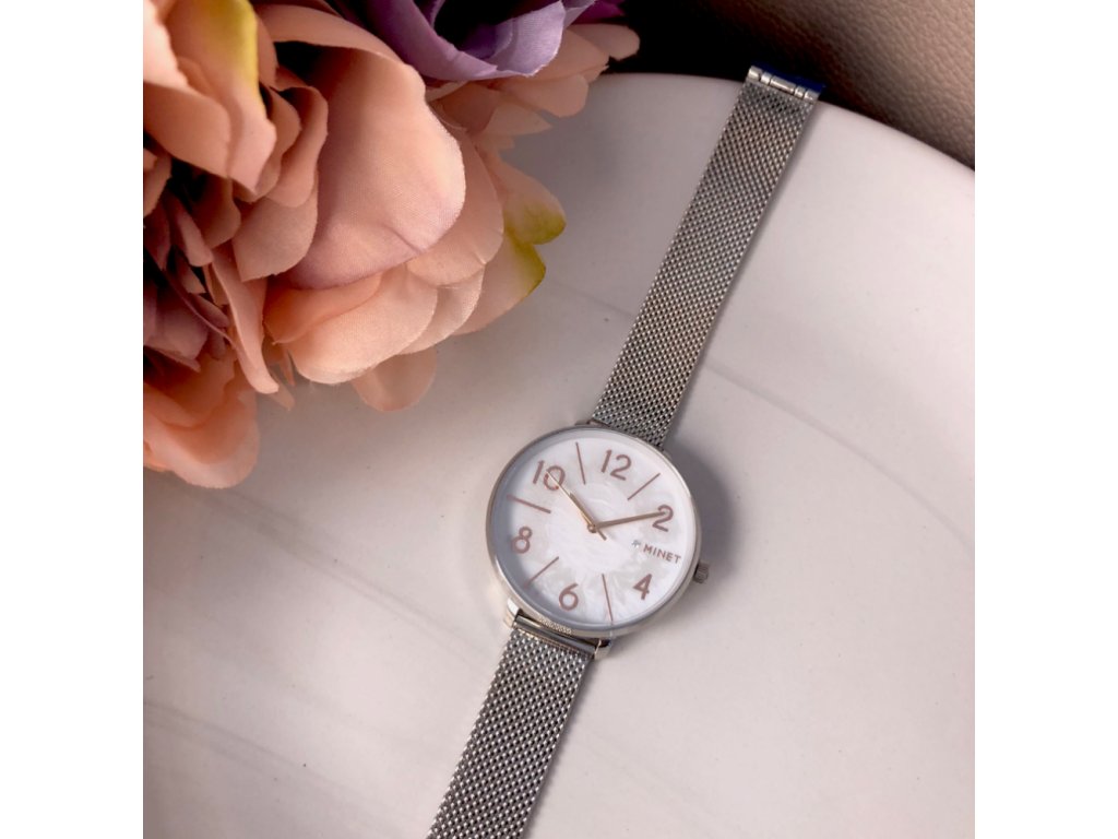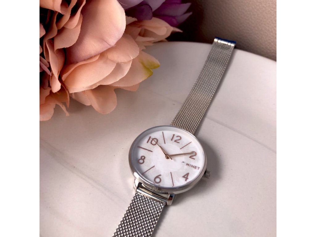 Elegantní hodinky české značky MINET s bílým perleťovým číselníkem a moderním ocelovým řemínkem milánského typu. Vyměnitelný řemínek se snadným systémem zkracování se přizpůsobí obvodu ruky. Hodinky jsou vyrobeny z hypoalergenní nerezové oceli.