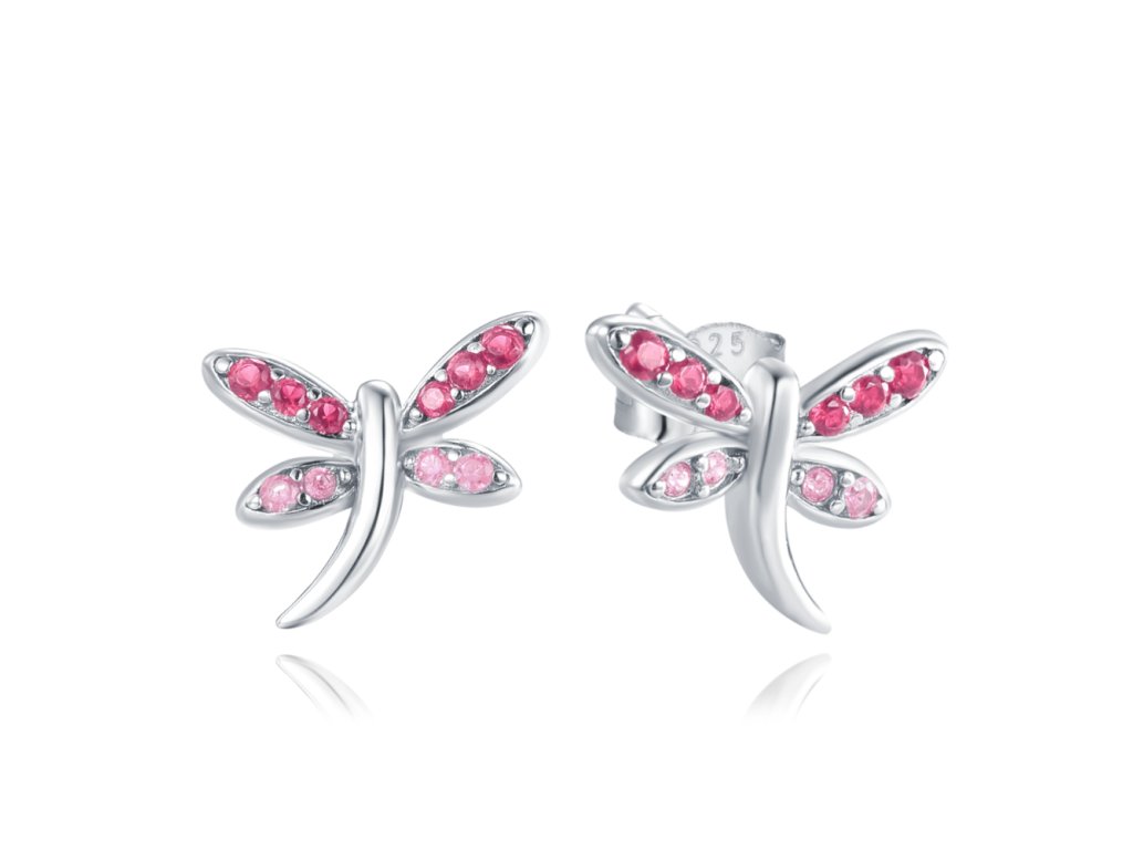 MINET Stříbrné náušnice vážky se světle a tmavě růžovými zirkony