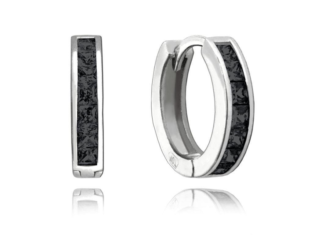 Černé náušnice kroužky jsou díky praktickému zapínání a tvaru pohodlné pro každodenní nošení. Černé zirkony se krásně třpytí a ozvláštníte jimi svůj outfit. Povrch stříbra je z rhodia, náušnice tedy neztratí svůj zářivý lesk a barvu.