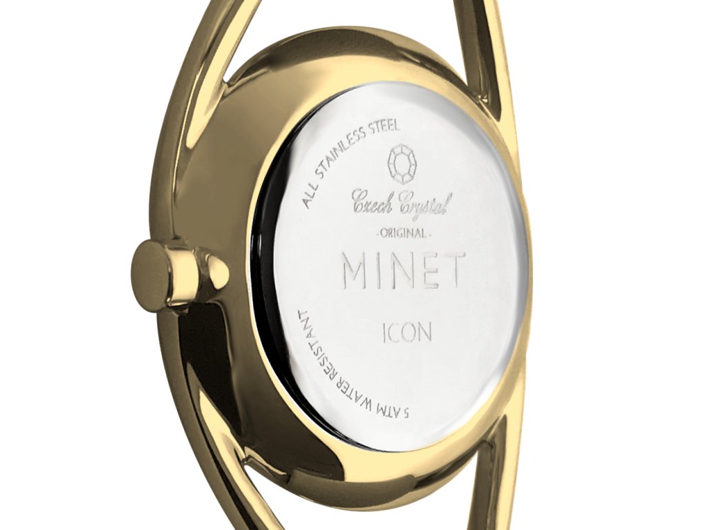 Elegantní hodinky české značky MINET se zlatým číselníkem a moderním ocelovým řemínkem milánského typu. Vyměnitelný řemínek se snadným systémem zkracování se přizpůsobí obvodu ruky. Hodinky jsou vyrobeny z hypoalergenní nerezové oceli.