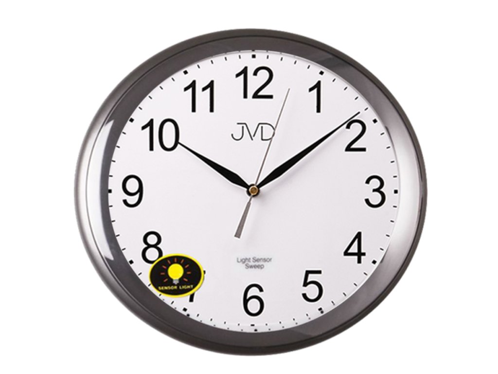 Moderní plastové hodiny značky JVD se senzorem stmívání, který rozsvítí číselník pokud je v okolí hodin málo světla a plynulým chodem zaručujícím tichý provoz.